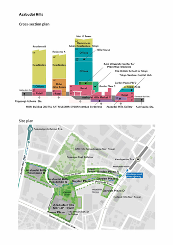วิสัยทัศน์ของ Mori Building สำหรับ Azabudai Hills คือการปรับเปลี่ยนให้กลายเป็นชุมชนแนวคิด “Green & Wellness” ตามมาตรฐานแห่งทศวรรษที่ 21 โดยผู้คนสามารถใช้ชีวิตร่วมกันกับธรรมชาติได้อย่างกลมกลืน  Azabudai Hills ครอบคลุมพื้นที่ประมาณ 8.1 เฮกตาร์ มีพื้นที่ทั้งหมดประมาณ 861,700 ม.² รวมถึงพื้นที่สำนักงาน 214,500 ม.² พื้นที่สีเขียว 24,000 ม.² ที่พักอาศัย 1,400 ยูนิต ห้องพักในโรงแรม 122 ห้อง ตลอดจนร้านค้าปลีกและร้านอาหารประมาณ 150 แห่ง Mori JP Tower เพิ่มสูงขึ้นอีก 330 เมตร ทำให้กลายเป็นอาคารที่สูงที่สุดในญี่ปุ่น ย่าน “เมืองภายในเมือง” ที่ได้รับการปรับปรุงใหม่นี้จะต้อนรับพนักงานออฟฟิศประมาณ 20,000 คน และผู้อยู่อาศัย 3,500 คน เมื่อคนเต็ม และคาดว่าจะต้อนรับผู้มาเยือน 30 ล้านคนต่อปี