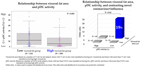 For the first time in the world, this collaboration found that people with high visceral fat area levels had low pDC activity. It was also suggested that visceral fat area and pDC activity, respectively, affect susceptibility to novel coronavirus infection and influenza, and that people with high visceral fat area and low pDC activity are particularly susceptible to these diseases.