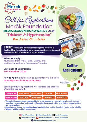 Merck Foundation (www.merck-foundation.com), the philanthropic arm of Merck KGaA Germany announced the call for applications for their Media Recognition ‘Diabetes & Hypertension’ Awards 2024 for the journalists from Asian Countries.
