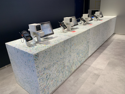 ผนังด้านนอกทำด้วย “ปูนปลาสเตอร์ไร้สารสังเคราะห์” ซึ่งทำจากการนำเปลือกหอย 336,000 ชิ้นที่ปกติแล้วจะถูกทิ้งมาใช้ใหม่ และใช้กาวและส่วนผสมอื่นๆ ที่ทำจากสาหร่ายทะเล สำหรับภาพสัญลักษณ์ที่เคาน์เตอร์เก็บเงินและห้องน้ำนั้น ได้ใช้ฝาขวดพลาสติกที่ถูกทิ้งแล้วและถังโพลีเอทิลีนสีขาวขุ่นรวมประมาณ 100 กิโลกรัม ซึ่งช่วยลดการปล่อยก๊าซคาร์บอนไดออกไซด์2ลงเหลือประมาณหนึ่งในสามของปริมาณที่ปล่อยออกมาจากการเผา นอกจากนี้ หมายเลขที่นั่งและป้ายโลโก้ในที่กำบังลมบางส่วนยังทำจากวัสดุตกปลารีไซเคิล เช่น เชือก ทุ่น และตะกร้า ซึ่งมีน้ำหนักรวมประมาณ 15 กิโลกรัม ม้านั่งในบริเวณนั่งรอทำจากต้นซีดาร์ที่ตัดแต่งในญี่ปุ่น แคปซูล “Bikkura Pon®” และสิ่งของอื่นๆ ที่ผู้เยี่ยมชมสามารถนำกลับบ้านได้ก็ได้รับการรีไซเคิลเช่นกัน และภาชนะใส่อาหารกลับบ้านทำจากวัสดุที่เป็นมิตรต่อสิ่งแวดล้อม โดยมีเป้าหมายเพื่อมีส่วนสนับสนุนในการบรรลุเป้าหมายการพัฒนาอย่างยั่งยืน (SDGs)