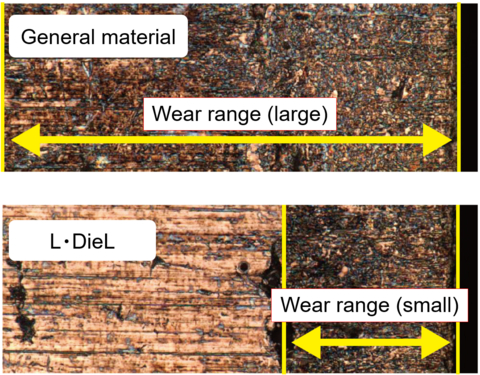 Difference in Wear Range between L-DieL Finish and General Materials *Base material: SUS304, 1/2H, 0.1mm, Clearance: 5µm, Stroke: 600spm